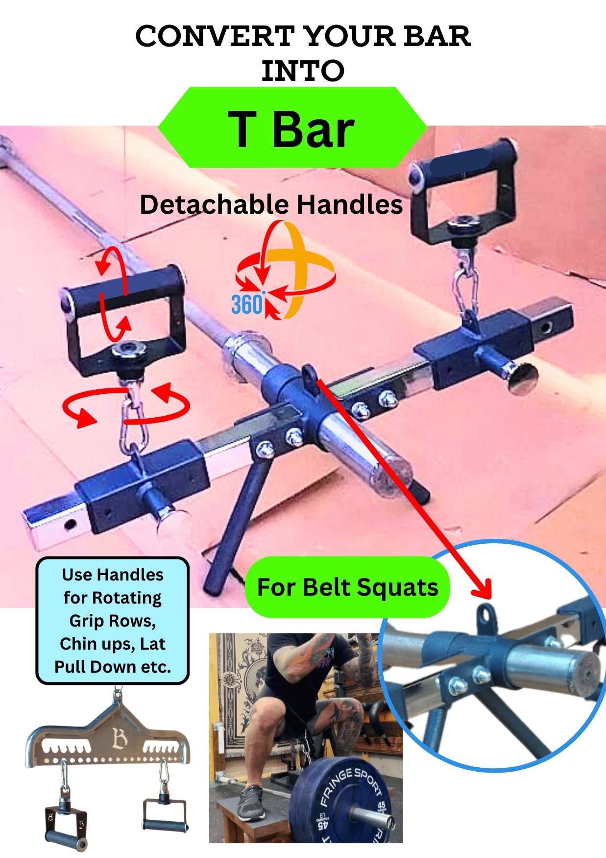 T Bar attachment for any barbell / Bar with Detachable Rotating Grips